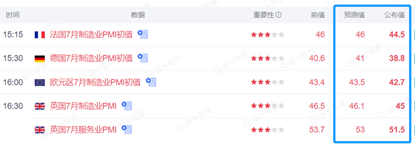 作为美元最大的对手盘,欧元则在本周一欧盘开始后快速下跌50余点,在本文撰写时稍微反弹。这主要是欧盘时间段公布的欧元区国家PMI数据大幅弱于预期导致的。尤其是制造业突出的德国,PMI指数竟然跌破了40,令人大跌眼镜。