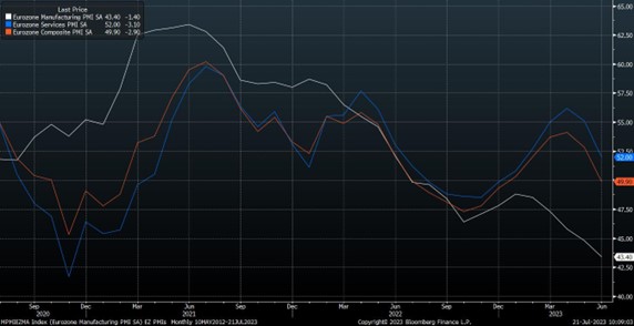 尽管最近对第一季度GDP的向上修正意味着欧元区避免了冬季的技术性衰退,但今年前三个月欧元区经济仍然停滞不前。先行指标表明这种停滞仍在继续,最近的综合PMI调查显示经济动力持续丧失,综合指数(下图橙色线段)跌破50的荣枯线。