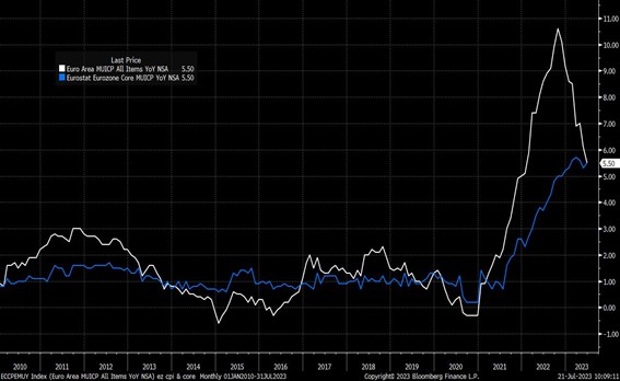 当然稳定通胀的任务也不容小觑。尽管欧元区核心通胀率(蓝色线段)在3月份达到同比 5.7% 的峰值,但最近开始重新加速,6 月份同比上升至 5.5%。这和普通通胀呈现一边倒的态势形成了对比。正是由于潜在通胀水平较高,劳动力成本上升继续构成进一步的上行风险。