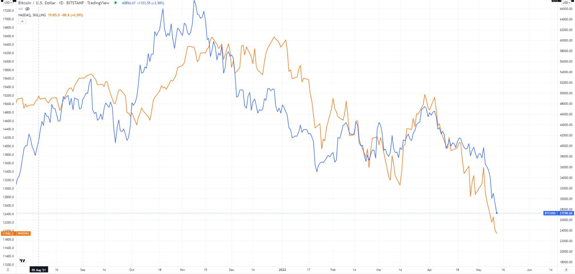 比特币(蓝)vs 纳斯达克100 (黄)