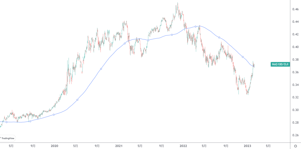 利率上升的速率变慢,其实更有利于科技类股票的上升。如果美国CPI数据进一步增速放缓, 科技股的表现或许好于综合性股票。用纳斯达克100指数除与道琼斯指数得到两者比例。如果纳斯达克100指数下跌比道琼斯指数更慢或者上升更快,这个比例都会增长。从目前来看,步入2023年这一比例快速上升,正在挑战200周期移动平均线,或许为未来哪种股票更强势提供了参考。