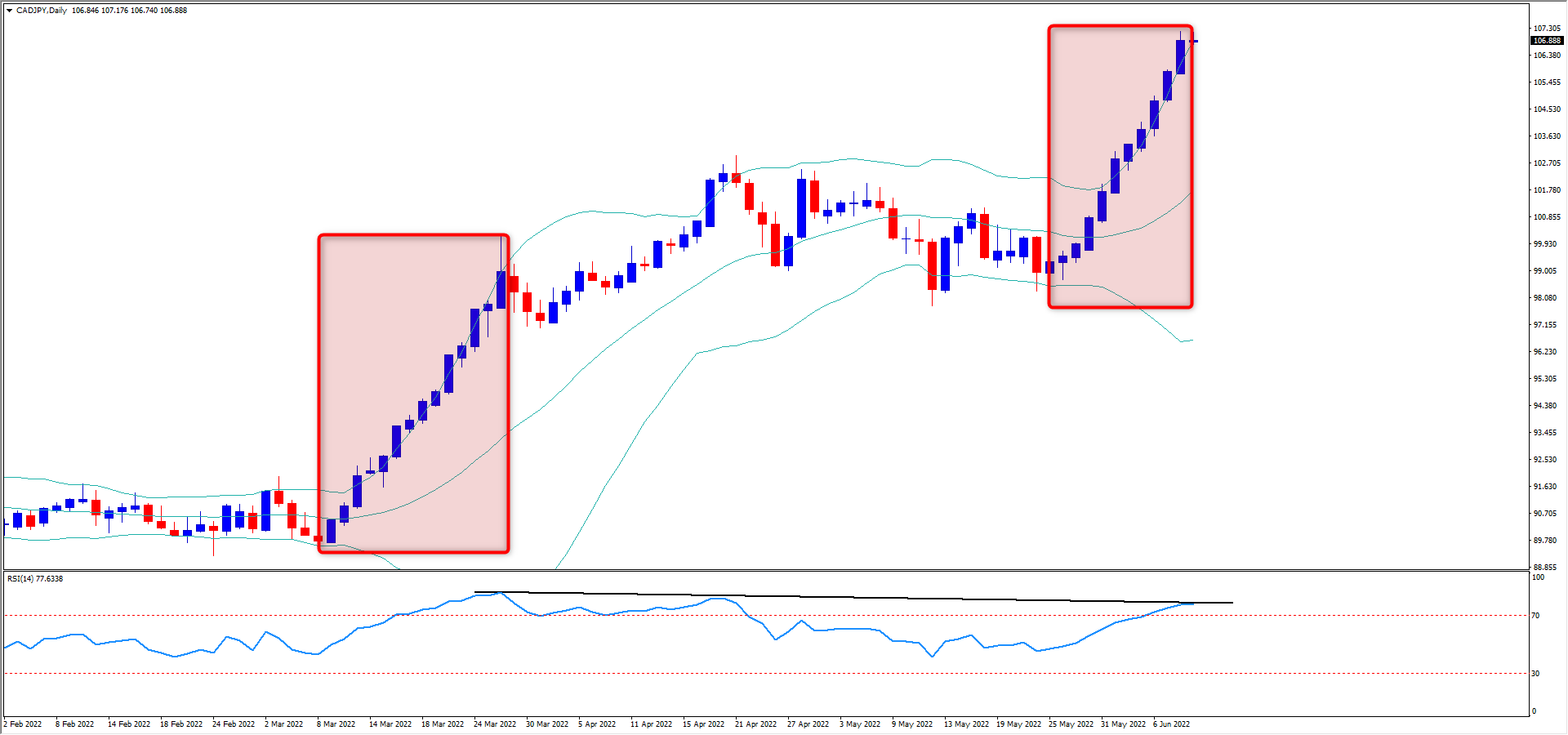 虽然越来越临近转折点,但短线来看这样的势头或许还能延续(短期均线仍旧运行在长期均线上方)。以CADJPY为例,在3月曾经一度连续14天拉升,最后一天的蜡烛图实体放大且留下较长的上影线。这次汇价有没有可能复制这一壮举呢?