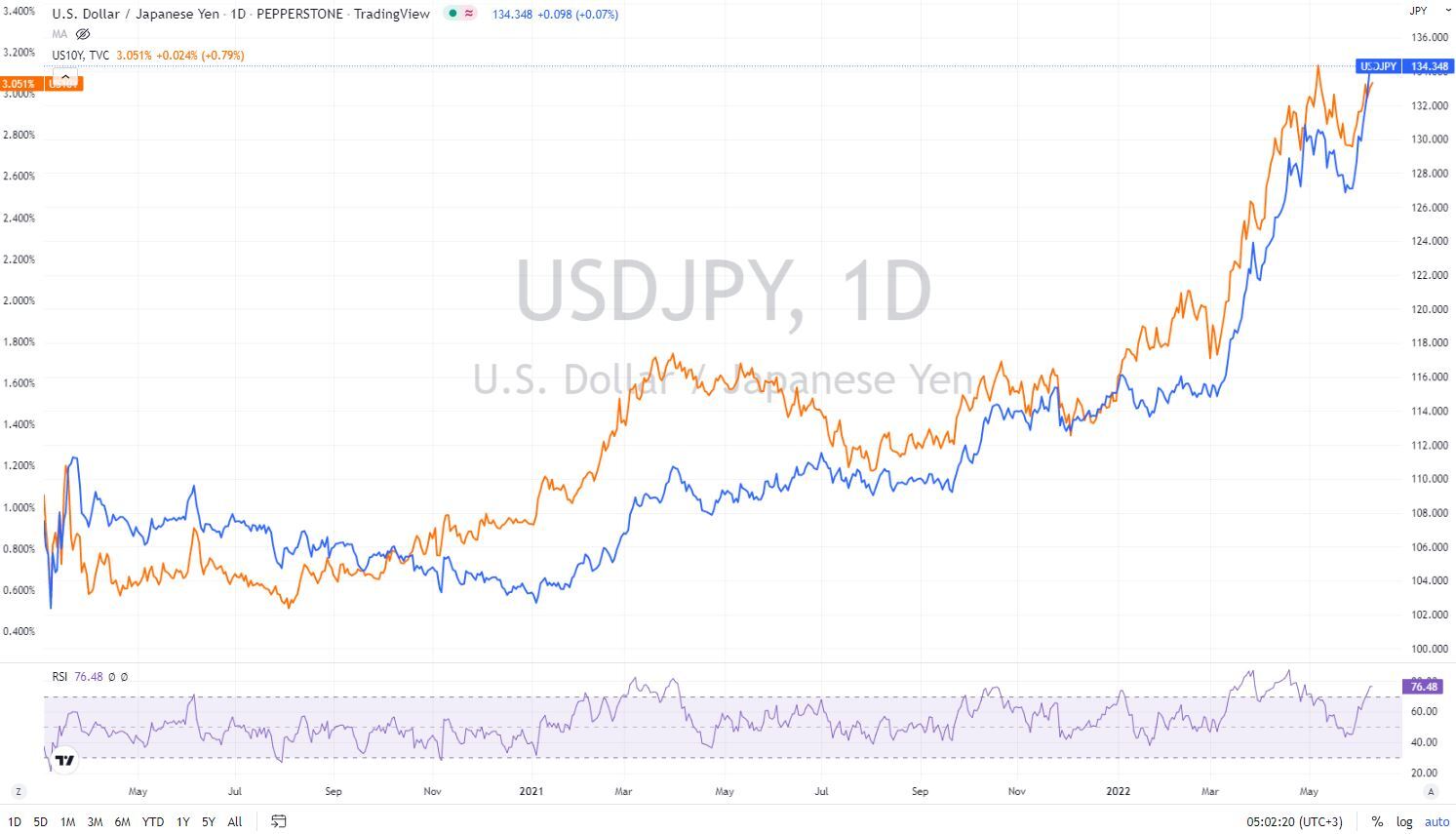 首先就是日本和美国的货币政策差异。众所周知,美联储目前正在纠结的以多快的步伐进行50个基点的加息,以及什么时候尽快将利率推升至中性水平(3%上下)?而与此同时,日本央行却坚定不移的走在宽松的道路上。随着两家央行的鹰/鸽差异愈发明显,两国基准利率也逐渐拉大,这也解释了资本流出日元且美元强劲的原因。10年期美债收益率再次攀上3%,成为了美/日上行的重要推动力。