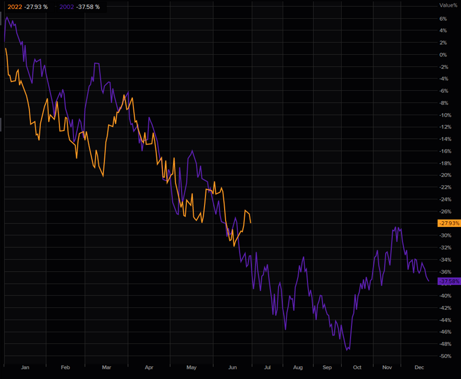 纳斯达克 2002年(紫) vs 2022年(黄) 来源:Refinitiv