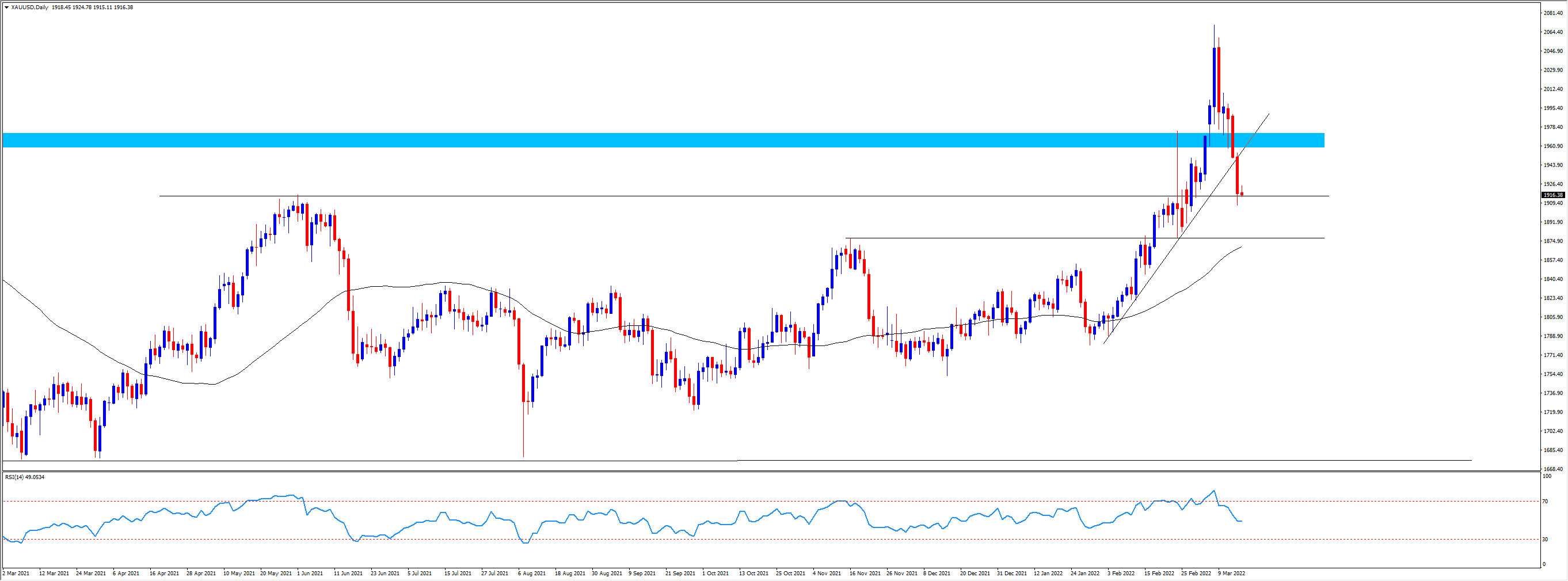 黄金跌破2月以来的上升趋势后,关注1915以及1878附近的支撑。但除非今天一次性加息50bp,否则金价跌穿50天均线的可能性并不高,尤其是在高通胀和地缘风险存在不确定性的情况下。