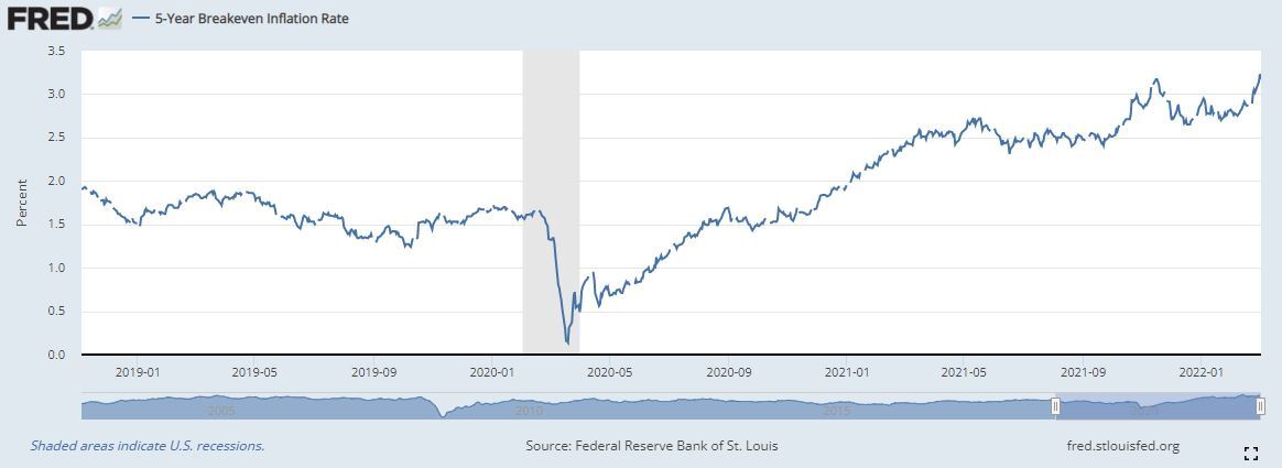 美国10年期的盈亏平衡通胀率(对未来的通胀预期)已经升至了2.73%,而5年期的更是刷新了记录高位至3.23%。想要让美国处于40年来最高水平的通胀率回归到2%的目标范围,已经落后于曲线的美联储理论上必须加快加息的步伐。