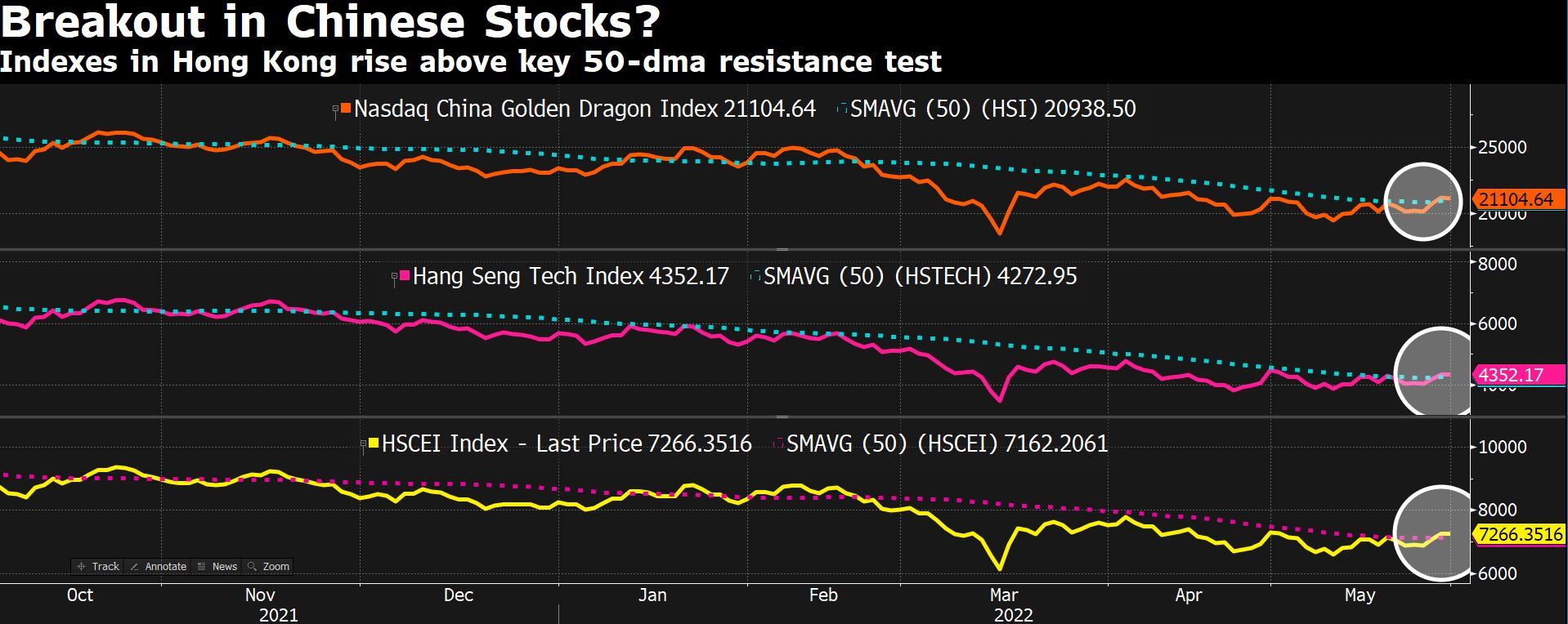 上图显示纳斯达克中国金龙指数、恒生科技和恒生指数均已突破了50天均线,扭转去年年初以来的长期下行趋势变得愈发现实。同样的走势也出现在沪深300、A50(CN50)等指数以及阿里巴巴、腾讯等个股上。