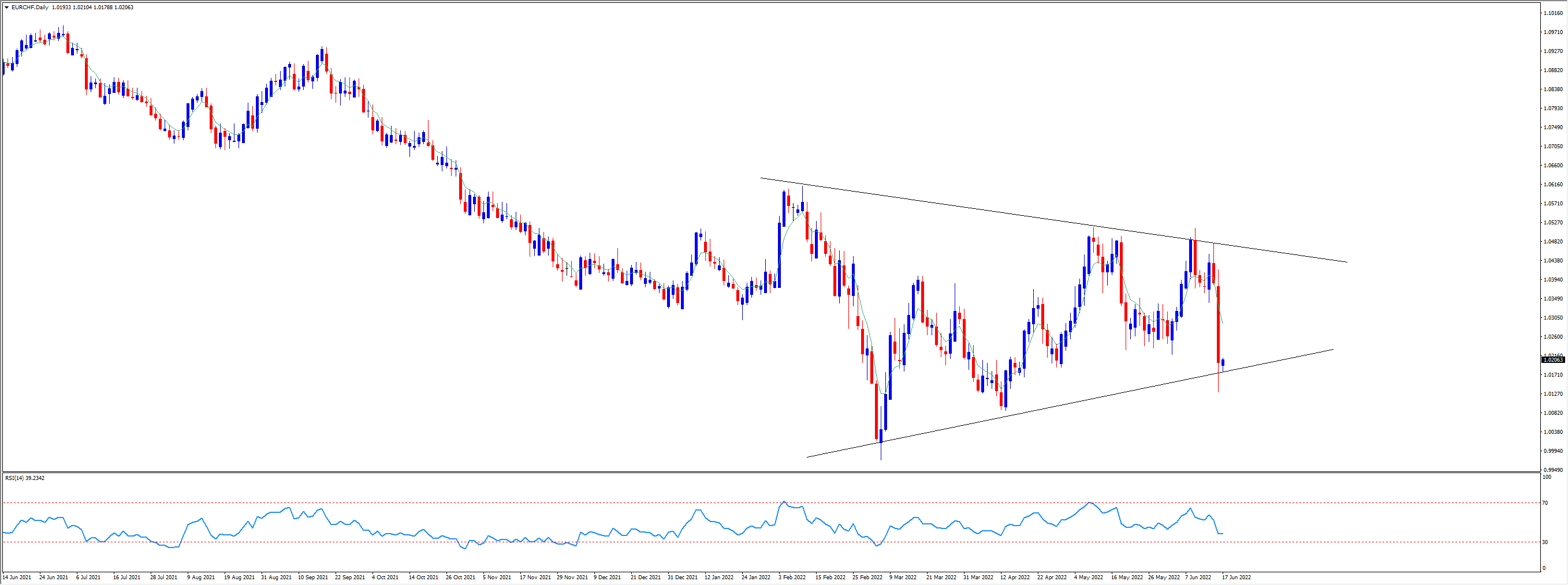 昨天令人意外的消息是瑞士央行突然宣布了50个基点的加息。这是15年以来的首次加息,而此前最大胆的预期都显示央行最早要到7月才会有所行动。瑞士法郎兑美元大张3%。欧元兑瑞郎录得自2015年取消与欧元挂钩以来的最大单日跌幅,并下探至2个月低点。