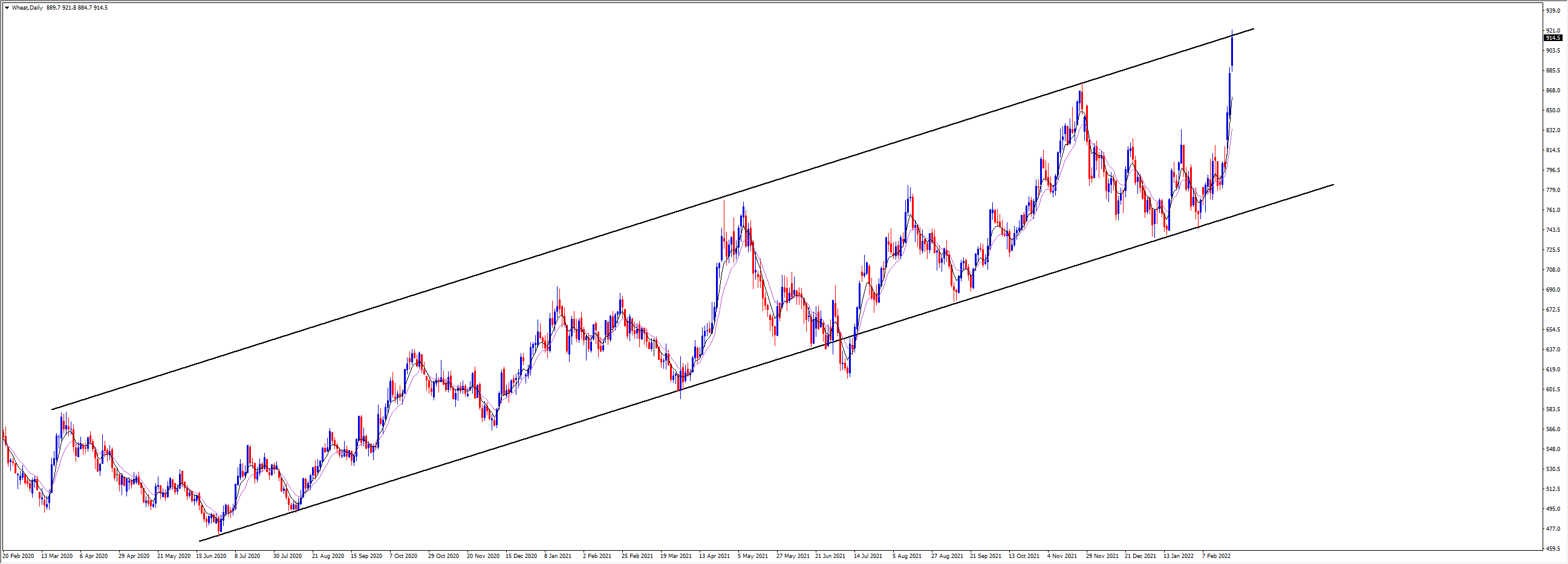 乌克兰的小麦出口占全球25%的份额。下图显示的小麦价格已经强势拉升至通道顶部,今年累计涨幅超过20%。玉米有也有着相似的走势,而中国是乌克兰玉米的最大出口国。
