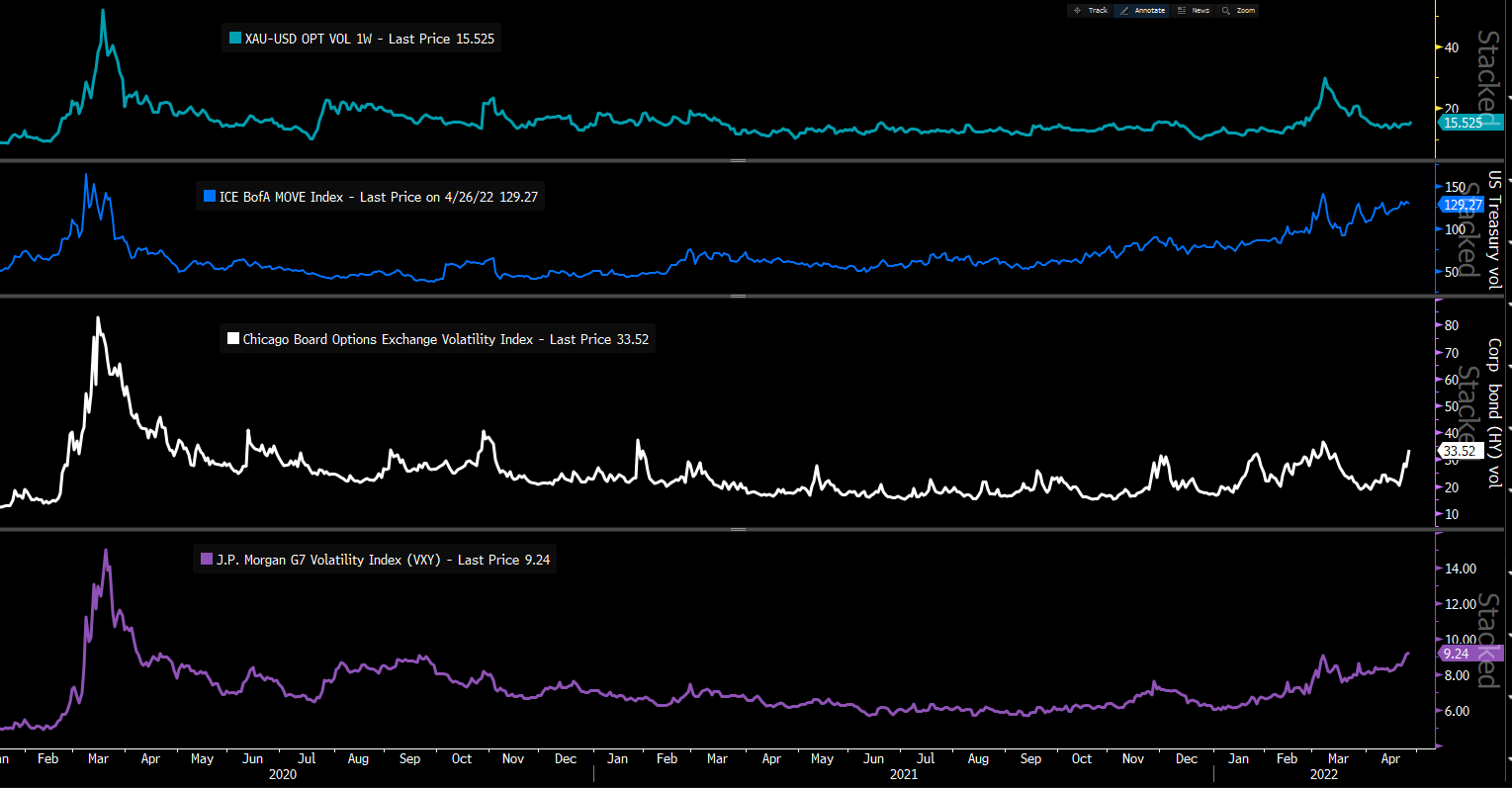 从上至下分别是黄金、美债、标普500和G7货币的隐含波动率