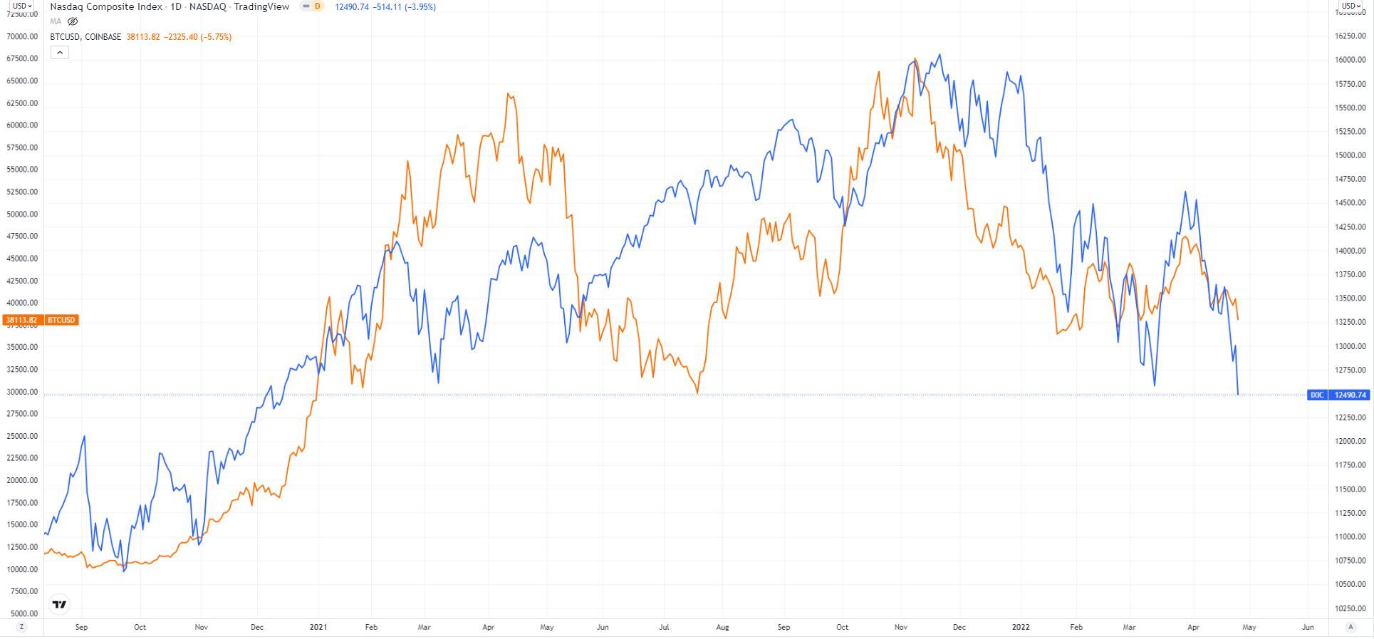 避险情绪升高同样打压了加密货币,下图显示出比特币(黄色)和纳斯达克指数(蓝色)之间近来相似的趋势。