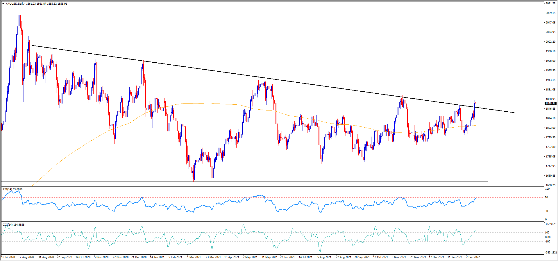 加息预期降温以及避险情绪升高将金价推升至了3个月最高的1857.78,上周收盘站上了2020年9月以来的下降趋势线的上方。接下去是爆发出更大的上涨动能,还是虚假突破后的回落,本周将见分晓。