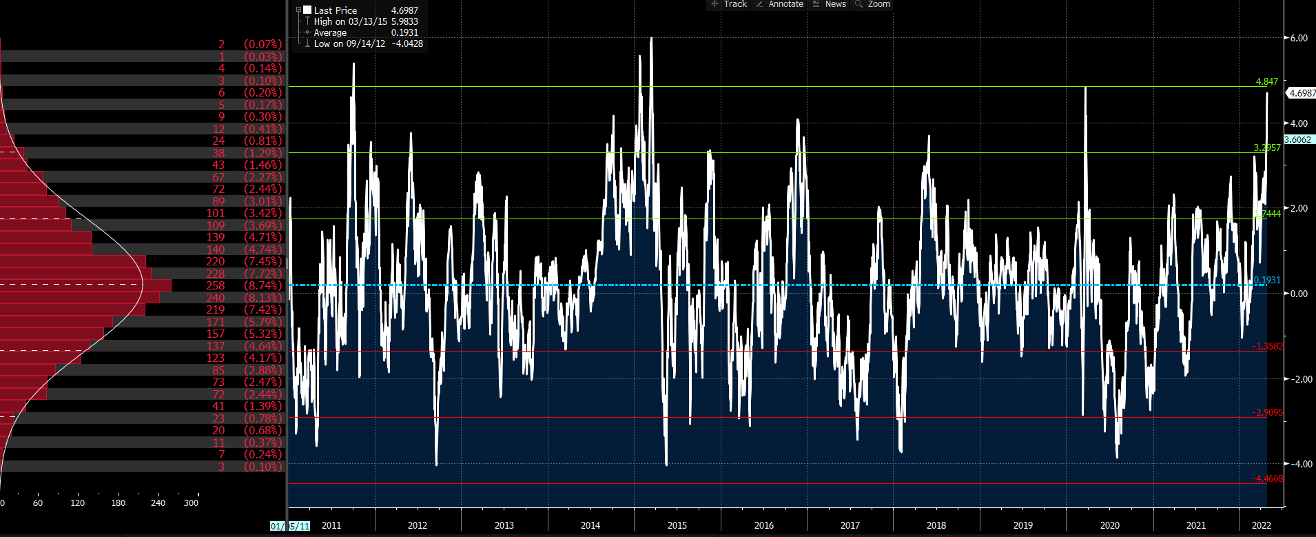 下图是彭博美元指数的一个月风险逆转指标(看涨期权波动率-看跌期权波动率),该数值接近2011年以来均值上方3倍标准差附近,可见投资者的看涨情绪已经达到了非常惊人的程度。