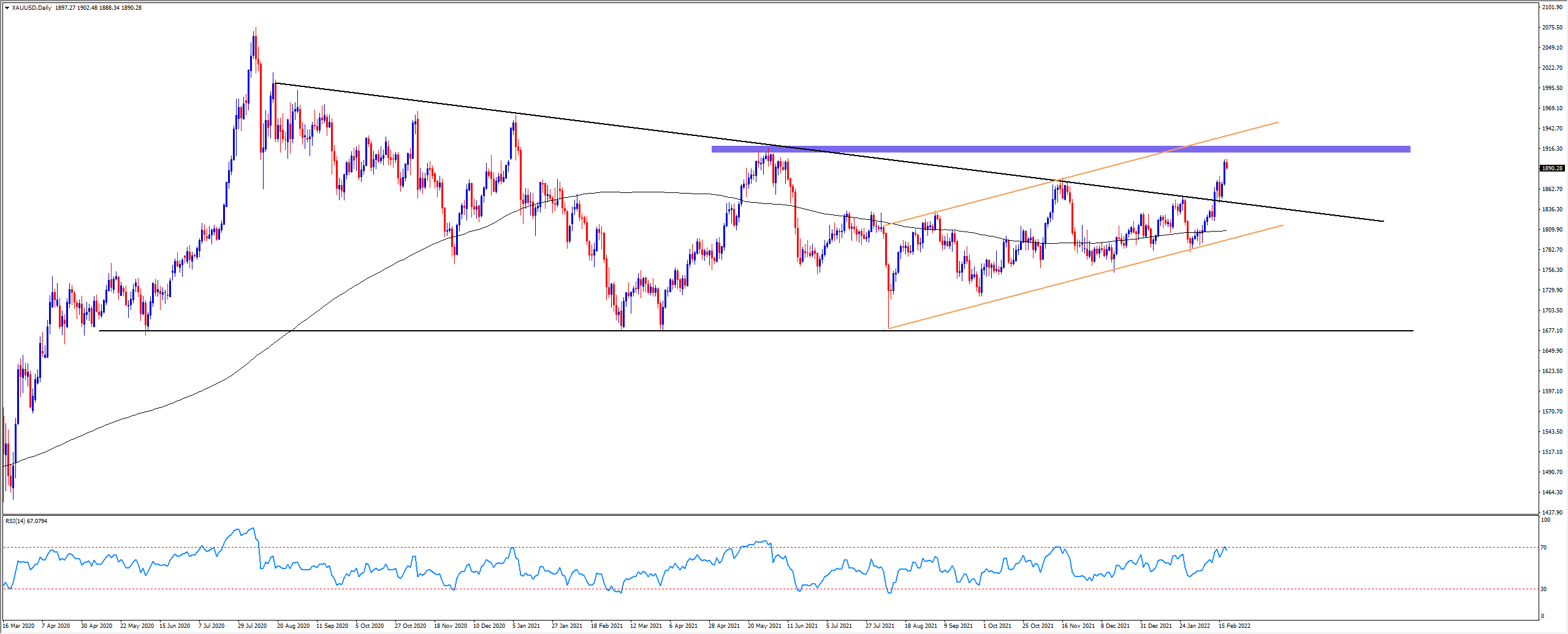 可以想象,一旦当如此激进的加息预期受到乌克兰局势的拖累而有所降温,双重因素叠加下黄金可能会爆发出更强劲的上涨动能。前高1916以及通道上轨,甚至是2000美元都将成为可能!当然目前也需要留意超买后的短线回调。