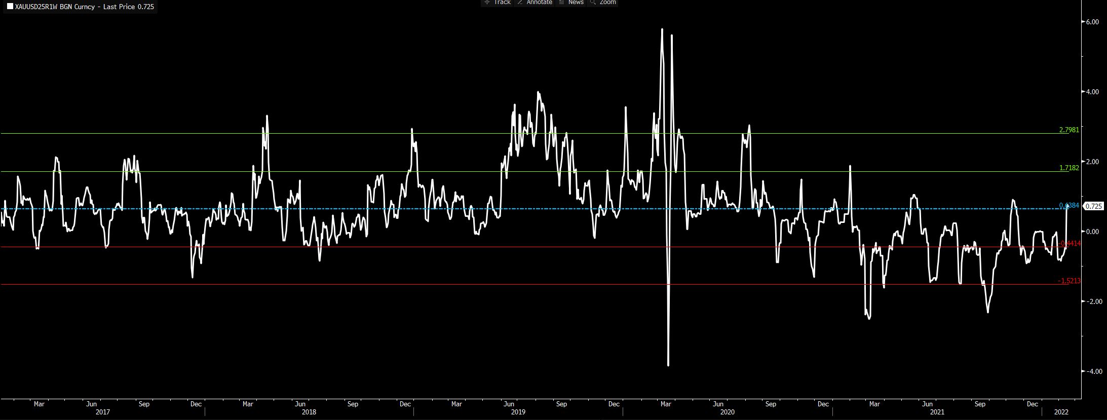 期货市场数据显示黄金多头的仓位上周小幅上升。期权市场的1周期限的风险逆转指标(看涨期权波动率-看跌期权波动率)已经回到正值区域并且接近过去5年的平均水平,这体现出市场对于金价短线的乐观情绪正在升高。
