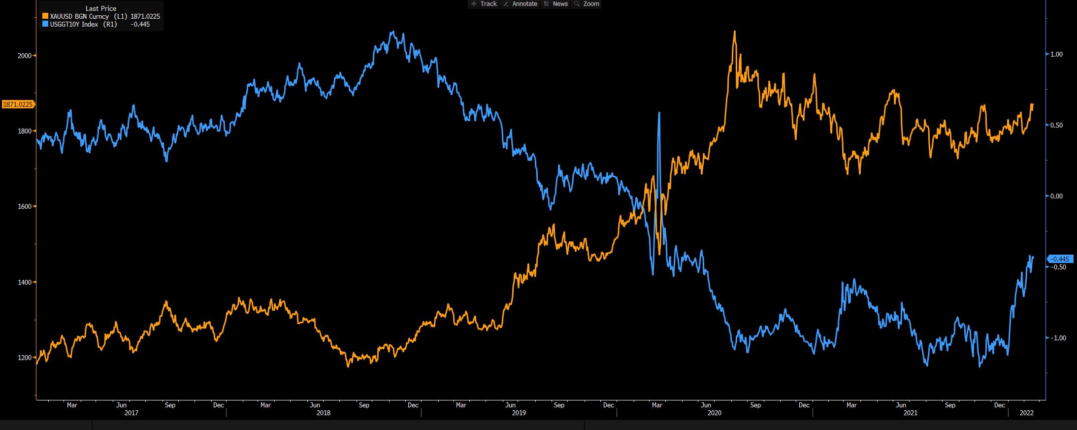 作为传统避险资产的美国国债同样受到投资者的追捧,导致美债收益率暂时从数年高点回落,这在一定程度上也巩固了金价的上涨势头。不过仔细观察过去一阶段美国10年期的实际利率(蓝)和金价(黄)的走势对比,可以发现两者长期以来的反向关系正在脱钩。
